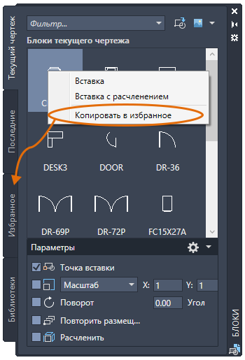 Палитра «Блоки» теперь позволяет копировать часто используемые блоки на новую вкладку «Избранное». На вкладку «Избранное» можно скопировать блок с любой другой вкладки палитры «Блоки».