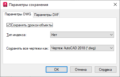 Позволяет определить, следует ли создавать слоевые и пространственные индексы при сохранении чертежа. Индексы используются для повышения скорости работы в процессе подгрузки внешних ссылок. Применение индексов незначительно увеличивает время сохранения чертежа.