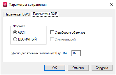 Задание формата создаваемого файла (ASCII или двоичный). Файлы DXF формата ASCII могут загружаться в текстовые редакторы; они совместимы с более широким спектром приложений. Файлы DXF двоичного формата более компактны. Чтение и запись операций с помощью файлов двоичного формата выполняется быстрее, чем при использовании файлов формата ASCII.