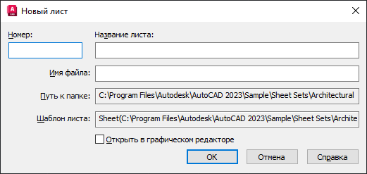 Создание нового листа в текущей подшивке. При этом создается новый файл чертежа (DWG), включающий в себя вкладку-лист с тем же именем, что и сам чертеж.