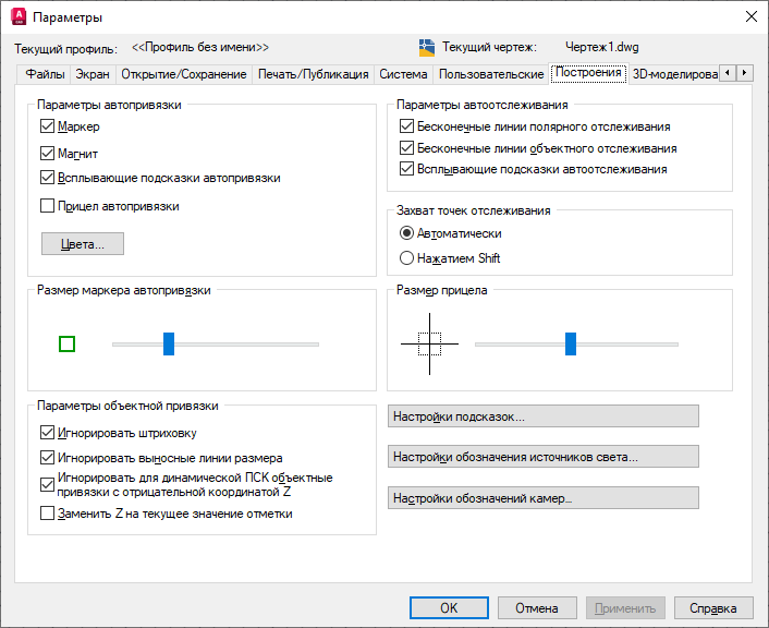 Управление параметрами автоотслеживания (AutoTrack ™ ). Автоотслеживание активизируется при включении полярного или объектного отслеживания (см. описание команды РЕЖИМРИС).