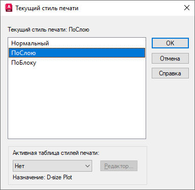 Список стилей печати, доступных для назначения объектам. Среди них стандартный стиль ОБЫЧНЫЙ. Стиль печати представляет собой совокупность переопределений для цвета, размывания, оттенков серого, присвоений перьев, интенсивности, типа и веса линий, торцов и соединений, способа заливки.
