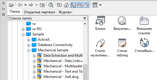 Вкладки «Папки», «Открытые чертежи» и «Журнал» обеспечивают различные способы доступа к содержимому.