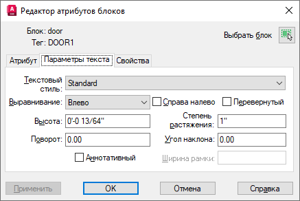 Задает свойства, определяющие способ отображения на чертеже текста атрибута. Цвет текста атрибута изменяется на вкладке "Свойства".