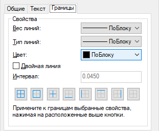 Назначение веса линий границам, которые задаются с помощью кнопки "Граница". При использовании широких линий может потребоваться увеличить отступы от границ ячеек.
