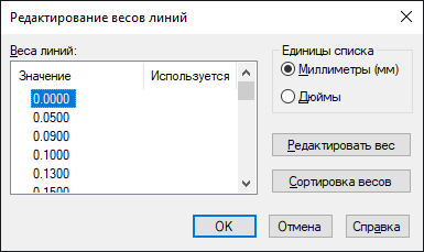 Список весов линий, входящих в таблицу стилей печати. Пользователь может изменять имеющиеся веса линий, но не может добавлять и удалять веса. Изменение значения веса линий в списке воздействует на все стили печати, где он используется.