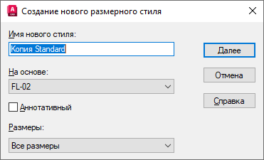 Здесь указывается имя нового размерного стиля, базовый стиль для его создания и типы размеров, к которым он должен применяться.