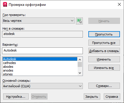 Проверка орфографии в однострочном тексте, многострочном тексте, в мультивыноске, в тексте атрибутов блоков, внешних ссылок, а также в тексте, добавленном к размерам.