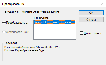 Задает режим преобразования типа внедренного объекта в тип, указанный в списке "Тип объекта".