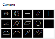 Обозначение вставляется в текстовое поле "Симв" диалогового окна "Допуски формы и расположения". Приведенная ниже таблица содержит описание обозначений.