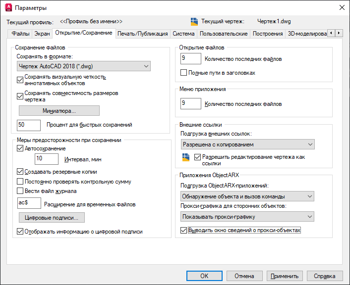 Интервал, мин: При включенной функции автосохранения задает частоту сохранения чертежа. (системная переменная SAVETIME)