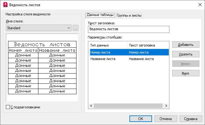 Список свойств столбцов ведомости листов. Каждая строка в списке соответствует одному столбцу. В ведомости столбца следуют в том же порядке (слева направо), что и записи о них в данном диалоговом окне.