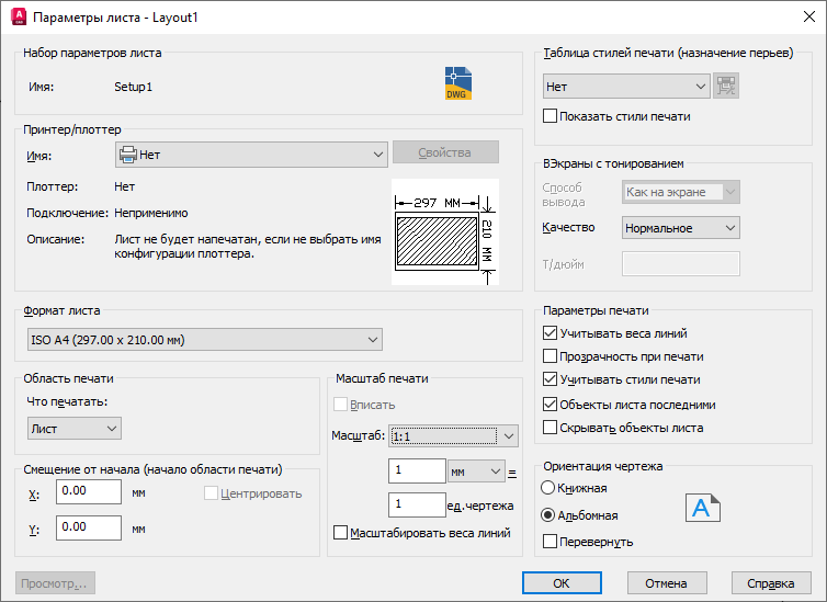 Параметры, относящиеся к весам линий, прозрачности, стилям печати, тонированным видовым экранам и к порядку вывода объектов на печать.