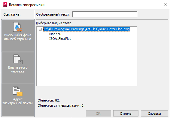 Вид из этого чертежа (диалоговое окно "Вставка гиперссылки")
