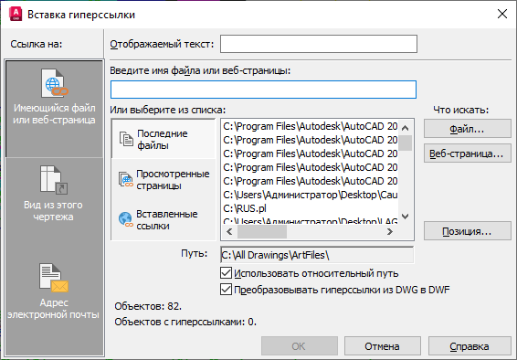 Выбор между использованием относительного и полного пути для гиперссылок. При выборе этого параметра в гиперссылке не сохраняется полный путь к связанному с ней файлу. Для относительного пути устанавливается значение, указанное в системной переменной HYPERLINKBASE, или, если этой переменной не присвоено никакого значения, относительный путь определяется как путь к текущему чертежу. Если этот параметр не выбран, в гиперссылке сохраняется полный путь к связанному с ней файлу.