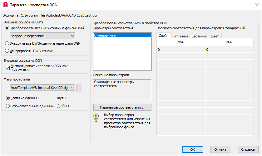 Позволяет выбрать и настроить параметры соответствия, используемые для текущего экспорта в DGN.