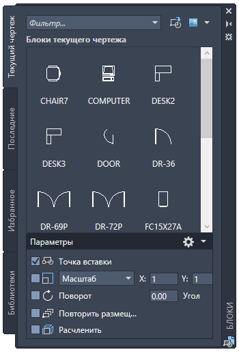 Отображение палитры с вкладками, с помощью которой можно вставить блок или чертеж.