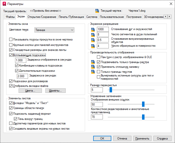 Параметры данной вкладки служат для настройки параметров рабочего экрана.