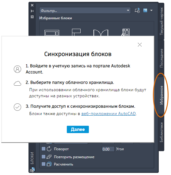 избранным блокам с разных устройств за счет использования учетной записи на портале Autodesk Account и синхронизации блоков с облачным хранилищем.