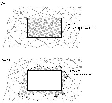Границы скрытия маскируют области поверхности, в результате чего триангуляция и, как следствие, горизонтали в этой области не видны. Границы скрытия используются для формирования углублений на поверхности, например для обозначения проекции здания.