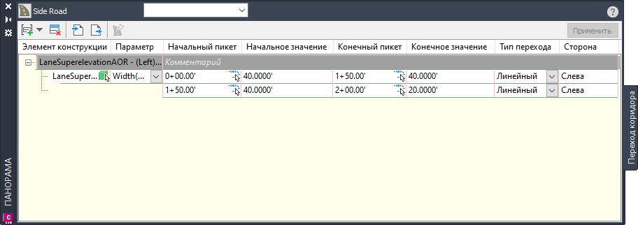 - Добавлен новый рабочий процесс, в котором для создания и редактирования переходов коридора используется панорамный вид. Его можно использовать, если требуется изменить значение параметра в элементе конструкции, например при создании поворотных полос или автобусных остановок.