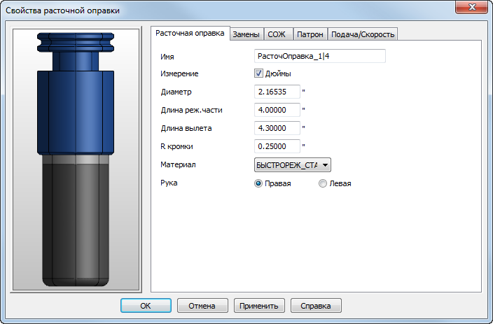 Материал инструмента — указание материала инструмента. Эта информация важна при вычислении подач и скоростей.