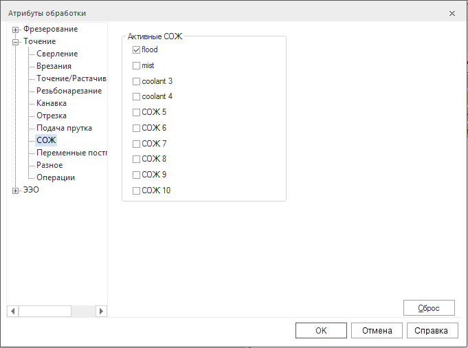 Выберите типы охладителей, которые нужно использовать. Доступные типы охладителей задаются в файле ЧПУ с помощью диалогового окна СОЖ в XBUILD.