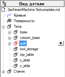 Давайте установим, как двигается станок. Первый элемент - это пиноль. Эта пиноль представлена как отдельное тело в файле детали. Вы можете увидеть пиноль (quill) в Виде детали и в графическом окне (здесь показана красным):