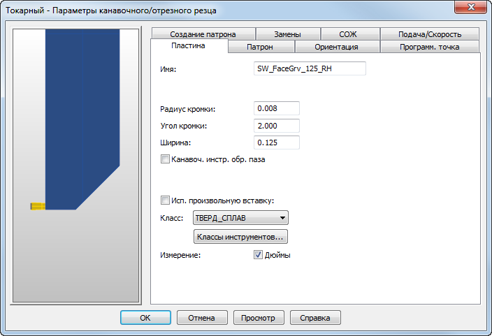 Нажмите на картинку предварительного просмотра инструмента, чтобы можно было её перемещать и масштабировать. Ориентация просмотра определяется параметрами на странице «Опции» > «Вид» > «Станок». Щёлкните правой кнопкой мыши по картинке, чтобы получить доступ к контекстному меню.