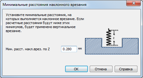 Чтобы открыть диалог Минимальные расстояния наклонного врезания, нажмите Минимальное врезание на вкладке Врезание диалога Свойства фрезерного элемента.