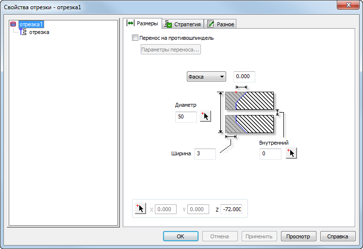 Перенос на противошпиндель — Выберите эту опцию, если хотите перенести деталь на противошпиндель. Появится кнопка Параметры переноса.