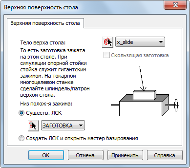 Тело Верхняя поверхность стола - это тело, к которому прикрепляются заготовка и зажимы. То есть заготовка и зажимы в симуляции станка перемещаются вместе с телом, которое задано в этом диалоге, как если бы они были потомками этого тела.