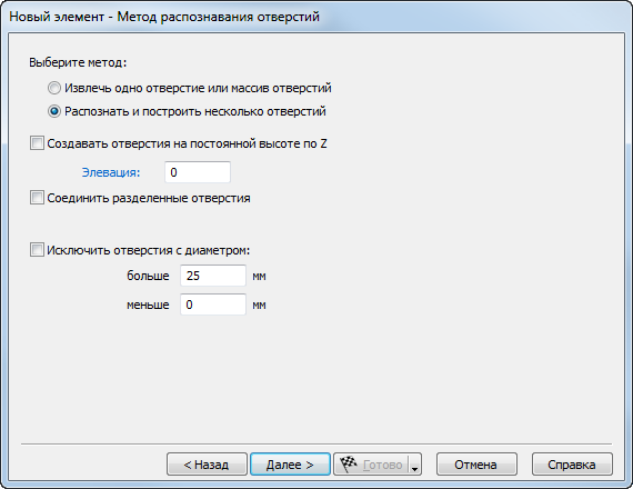 Страница Метод распознавания отверстий предоставляет выбор для распознавания одного или всех отверстий в текущем установе.
