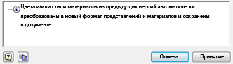 Материалы переносятся из стилей материалов в материалы. Эту операцию отложить нельзя. Пользовательские материалы, которые были добавлены, переносятся. Использование нового Обозревателя материалов и Редактора материалов для изменения существующих или создания новых материалов.