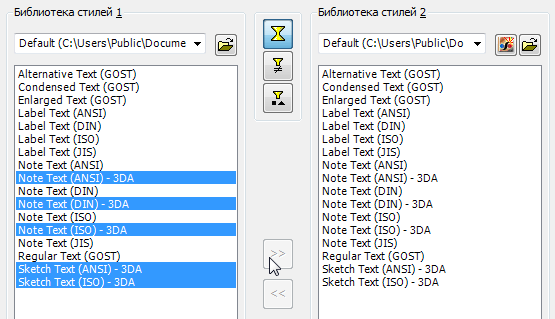 - В примере, приведенном на предыдущем рисунке, стиль освещения выбран в области "Выберите тип стиля" (список в левой части диалогового окна). Кроме того, пути папок старой и новой библиотеки стилей выбраны с помощью соответствующей кнопки обозревателя. Их содержимое отображается на левой и правой панелях соответственно, и на панели старой библиотеки стилей выделена кнопка "Перенести".
