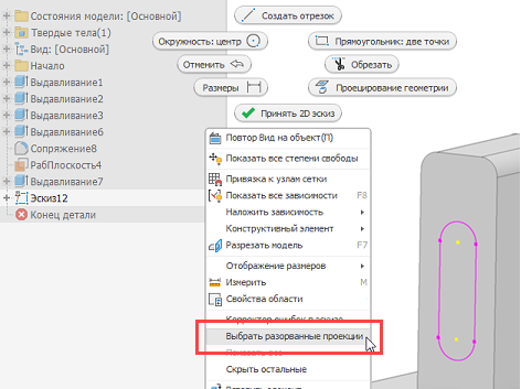 Теперь спроецированные ребра можно выбрать одним щелчком мыши. Отредактируйте эскиз с разорванной геометрией, щелкните правой кнопкой мыши узел эскиза в обозревателе или в пустом пространстве активного окна, выберите Выбрать разорванные проекции и используйте клавишу DELETE или замените разорванные проекции.