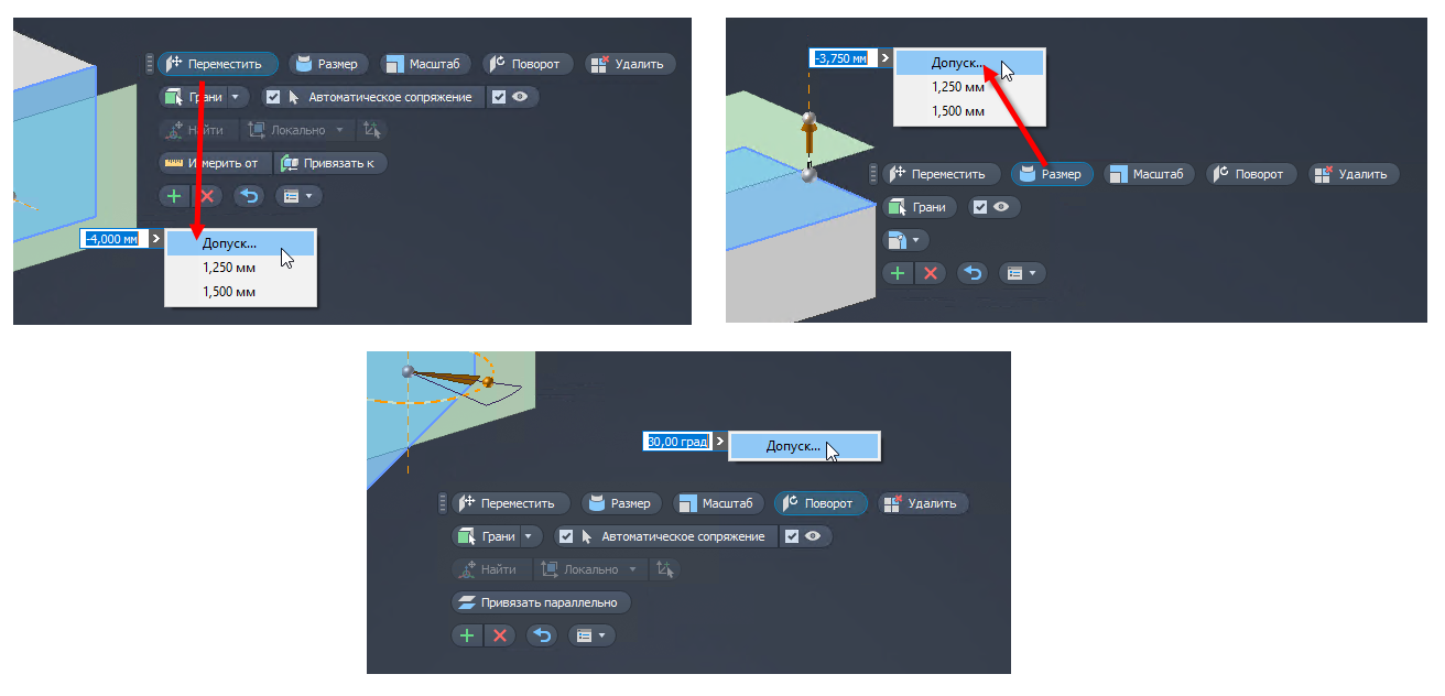 Теперь можно задавать допуск при непосредственном редактировании элементов, поскольку соответствующий параметр добавлен в контекстное меню для команд «Перенести», «Размер» и «Повернуть».