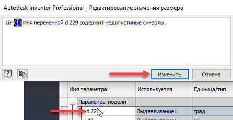 Если имя параметра неверное (например, с пробелом или запятой), в диалоговом окне предупреждения появляется кнопка для редактирования, позволяющая быстро исправить имя. Раньше можно было только отменить изменения и начать операцию заново.