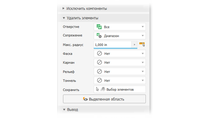 - Карман: распознавание вычитаемых элементов операций выдавливания, вращения, сдвига и т. д.