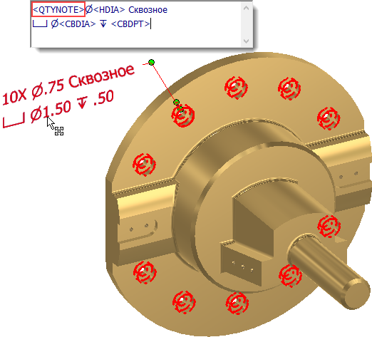 Перекрестное выделение доступно для отверстий, участвующих в размере отверстий 3DA при использовании команды QTYNOTE.