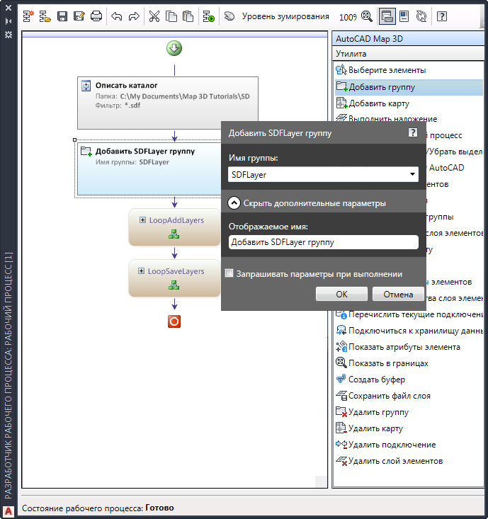 В этом уроке выполняется редактирование встроенного рабочего процесса, в котором слои создаются в Диспетчере задач из папки с файлами SDF и сохраняются в файлы .layer. Необходимо создать группу, а затем переместить в нее слои.