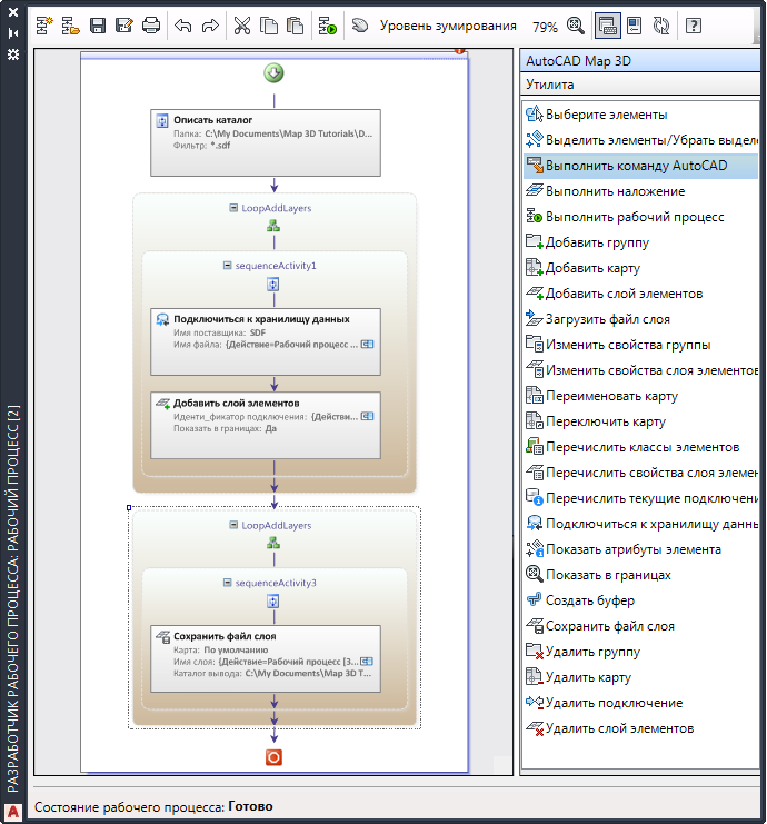 В данном случае действие «Для каждого» переименовано с использованием описательного названия «Повторить добавление слоев». Это действие анализирует каждый файл SDF в папке, указанной при выполнении действия «Показать содержимое папки». Для каждого повтора выполняется подключение к файлу SDF и добавление слоя элементов в Диспетчер отображения.