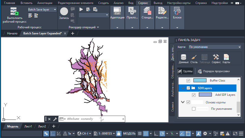 При запуске рабочего процесса в Инструментарий AutoCAD Map 3D выводится список файлов SDF в указанной папке. Затем он создает группу в Диспетчере отображения, в которую будут добавляться создаваемые слои. Выполняется подключение к файлам SDF в указанной папке. Для каждого чертежа в указанной папке устанавливается подключение, добавляется слой в Диспетчер отображения, а слои перемещаются в новую группу.