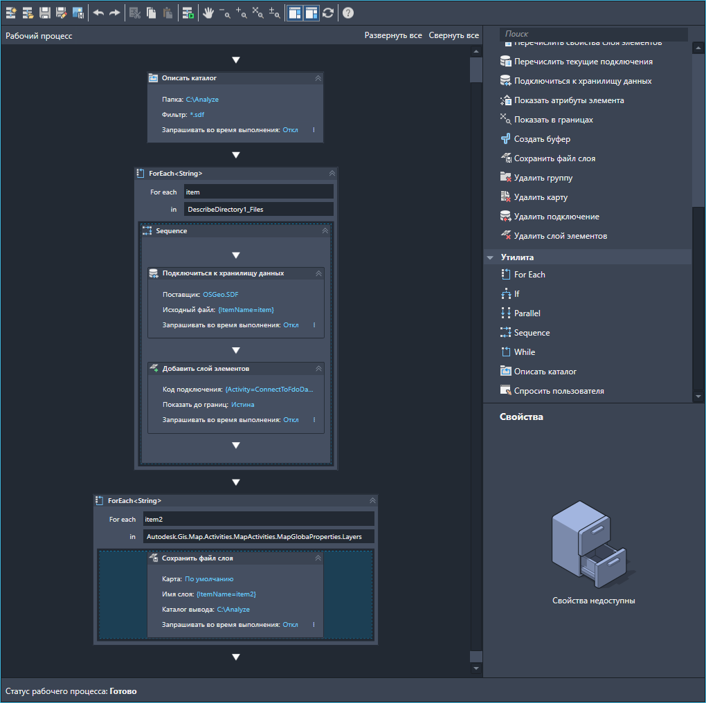 В данном случае действие «Для каждого» переименовано с использованием описательного названия «Повторить добавление слоев». Это действие анализирует каждый файл SDF в папке, указанной при выполнении действия «Показать содержимое папки». Для каждого повтора выполняется подключение к файлу SDF и добавление слоя элементов в Диспетчер отображения.