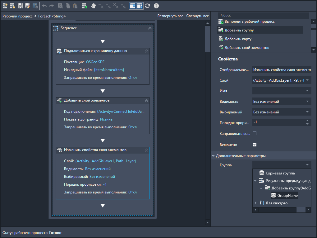 Так как требуется изменить свойство «Группа» для каждого добавляемого слоя, поместите это действие внутри действия типа «Для каждого» с именем «Повторить добавление слоев».