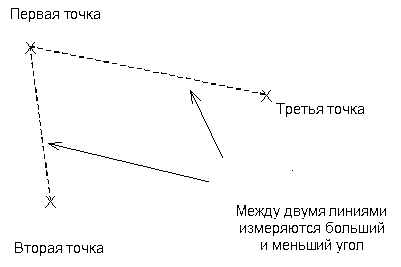 На рисунке три точки задают две линии. Между ними выполняется измерение внешнего и внутреннего углов: