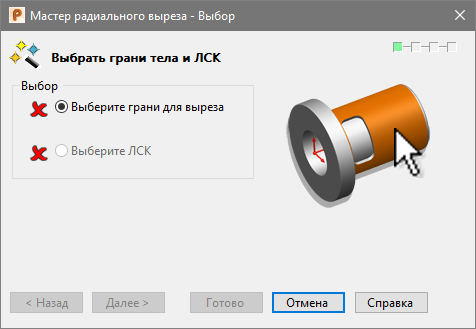 - Выберите созданную ранее ЛСК и цилиндрическую поверхность, в которой нужно сделать вырез, а затем нажмите кнопку Далее.