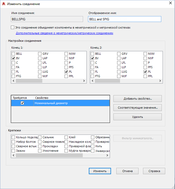 - В диалоговом окне "Настройка проекта", щелкнув "Параметры соединения трубопровода", откройте диалоговое окно Настройка соединения.