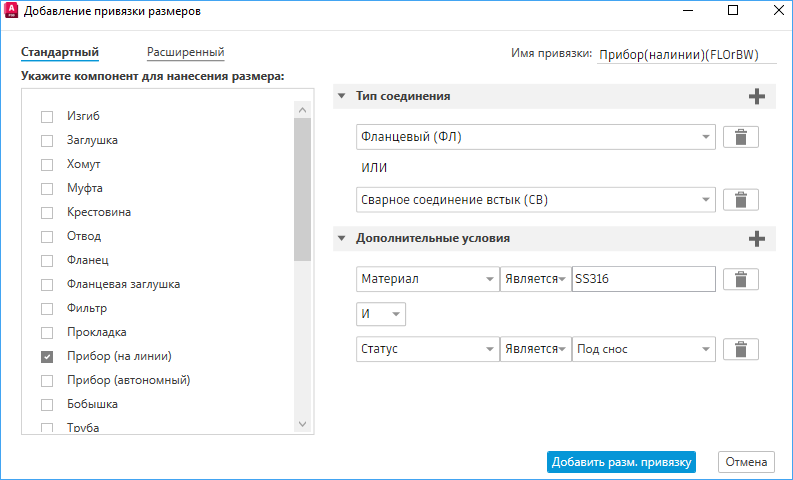 Добавление одного или нескольких объектов к размерным привязкам или исключениям. Можно указать один или несколько типов соединения, чтобы ограничить нанесение размеров только компонентом с определенным типом соединения (например, фланцевым клапаном). Примените условия к компонентам трубопровода с определенным статусом, областью применения или другими условиями.