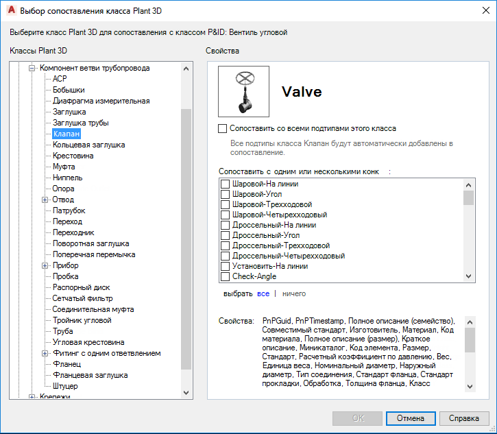 - В разделе "Классы Plant 3D" разверните структуру. Щелкните класс (например, Клапан).